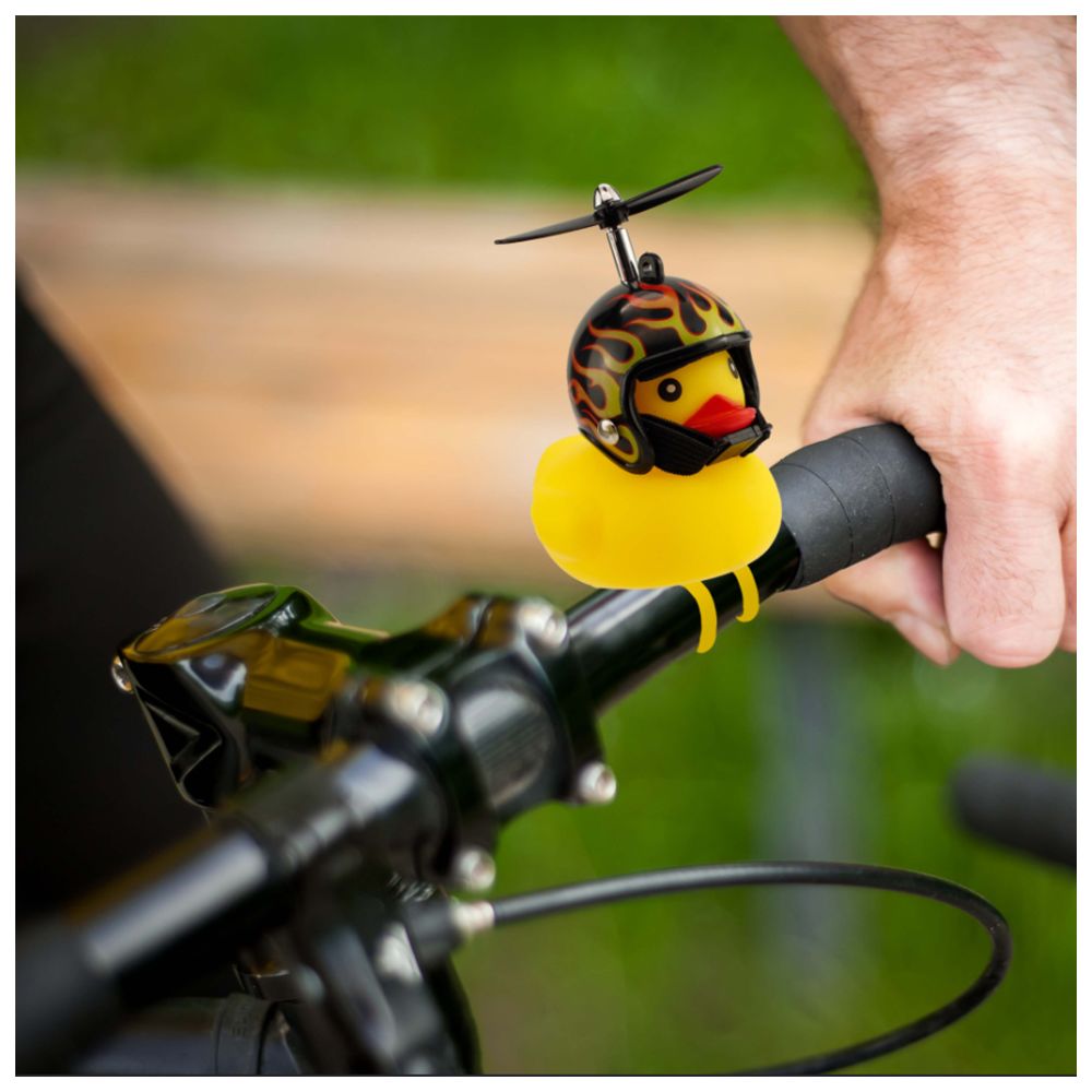 Dit is een leuk cadeau voor fietsers die a) eindelijk afscheid willen nemen van de conventionele, saaie bel en b) dol zijn op piepende eendjes Het is leuk dat in dit geval a) en b) op de leukste manier worden gecombineerd: met onze grappige Rubber Duck die dankzij een universele houder vrolijk op het stuur zit, terwijl de kleine propeller op de hot rod helm vrolijk ronddraait in de wind.