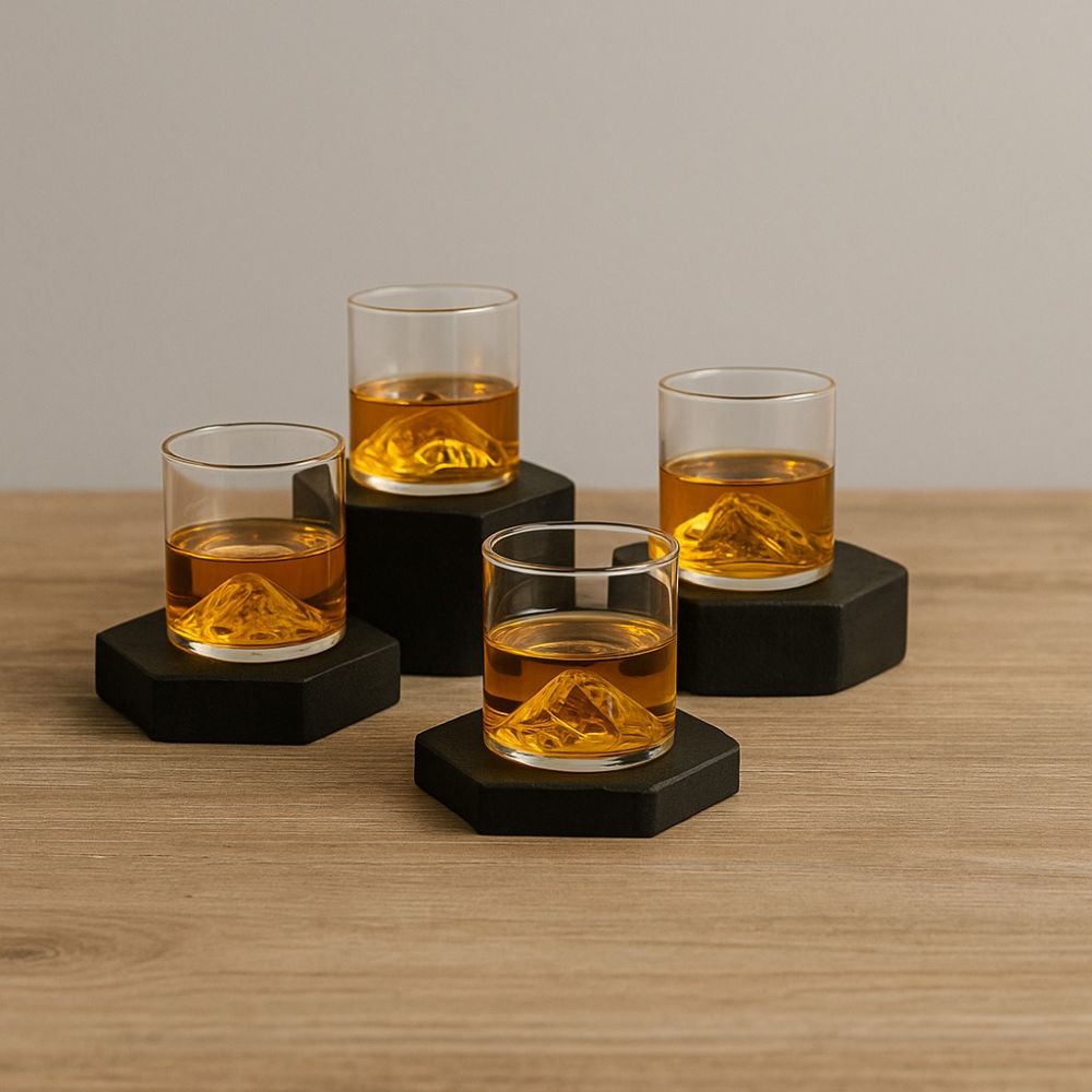 Een shot met uitzicht? Deze “Shots on the Rocks” shotglazen brengen een visueel avontuur in je glas. Op de bodem prijkt een gestileerde bergtop, die elke drank karakter geeft en speelt met licht en kleur.